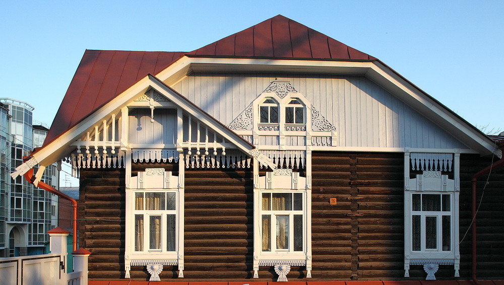В облике особняка на Вершинина узнаются все характерные черты деревянного модерна: открытый бревенчатый сруб (в данном случае рубленый «в лапу»), выступающий контрастным фоном для окрашенных в светлые тона элементов убранства, асимметричность фасадов и кровли, плоский графичный декор.