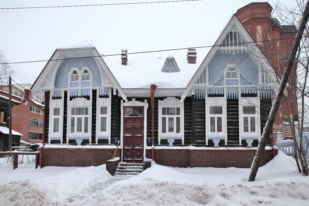 В облике особняка на Вершинина узнаются все характерные черты деревянного модерна: открытый бревенчатый сруб (в данном случае рубленый «в лапу»), выступающий контрастным фоном для окрашенных в светлые тона элементов убранства, асимметричность фасадов и кровли, плоский графичный декор.