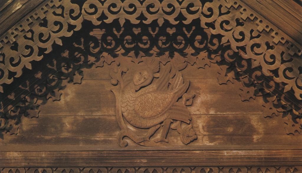 Четырехскатные крыши домов украшают фронтончики с треугольными и полуциркульными завершениями, прерывающие протяженные карнизы и привлекающие внимание. Во внутреннем поле фронтончиков размещают резные солярные знаки, резные изображения птиц, вазонов с цветами и др.