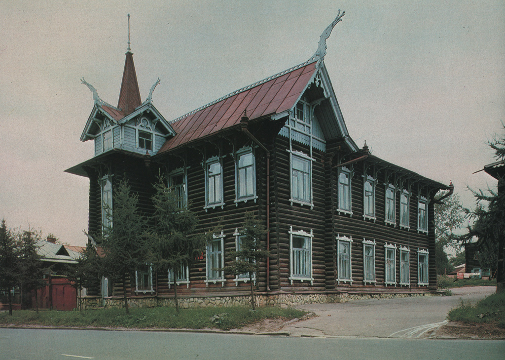 Разнообразные службы (амбары, каретники, конюшни и др.), заборы, ворота и калитки также украшают резьбой. В окраске обшивки фасадов, наличников, малых архитектурных форм применяются брусничный, светло-серый, светло-зеленый цвета. В это же время в Томске появляются дома дворцового типа и дома-терема с запоминающимся силуэтом, причудливыми башенками, обилием пропильной резьбы – ажурной и накладной.