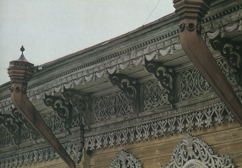 После отмены «образцовых фасадов» деревянная резьба обильно украшает карнизы, фризы, наличники, лопатки. Ее многообразие проявляется в различных видах резьбы. Прорезная, пропильная и объемная резьба причудливо сочетается в элементах деревянных домов на фоне наличников, карнизов, лопаток или работает на просвет подобно кружеву, пропуская солнечные лучи и создавая глубокую и прозрачную тень.