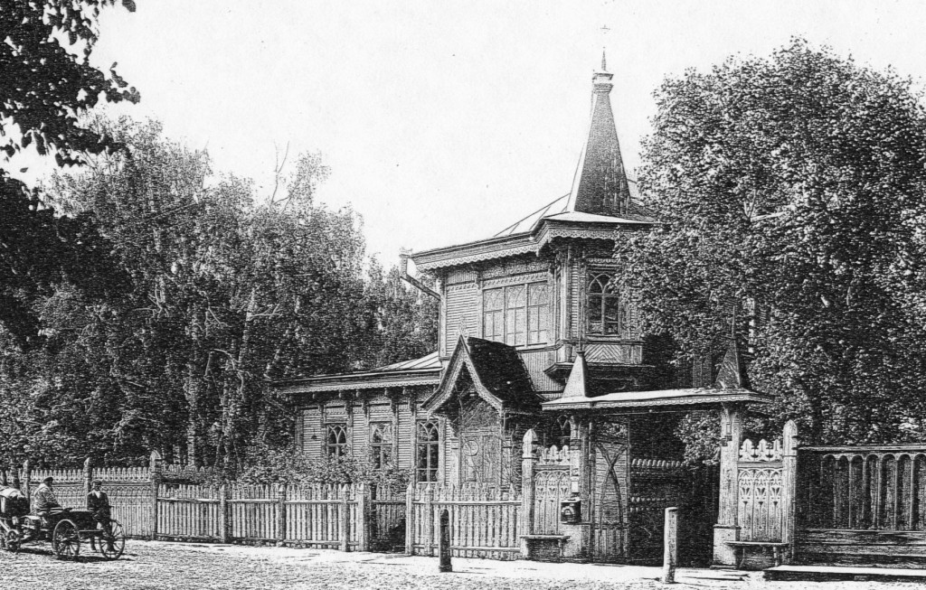 Жестяные водосточные трубы имеют фигурные лепестковые навершия. Окна цокольного этажа с лучковыми перемычками обрамлены наличниками. Оконные проемы всего здания различаются по размерам. Очелья окон первого этажа одноэтажного объема и второго этажа в уровне фриза декорированы пропильной резьбой растительного орнамента с мотивом пальметты и фланкированы резными кронштейнами. Аналогичные кронштейны имеются под карнизом здания, они наложены на угловые лопатки, закрывающие места врубок. Под окнами первого этажа проходит пояс вертикальной обшивки, под оконными проемами обшивка в елочку, еще один пояс вертикальной обшивки выполнен между первым и вторым этажами.