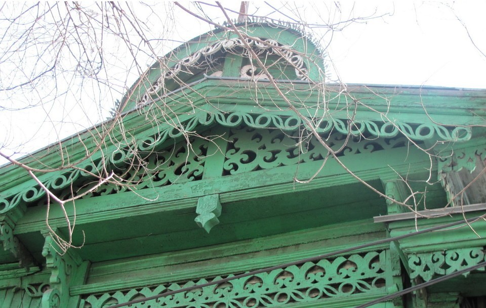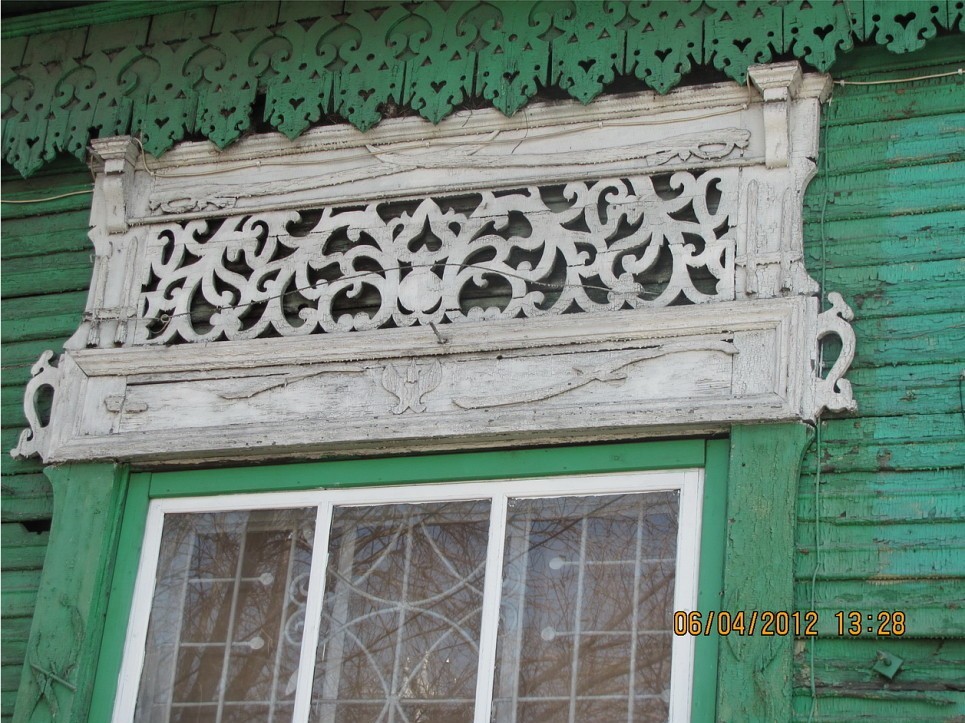 Окна флангов фасада более широкие, в центральной части фасада дополнены еще одной фрамугой, выделены наличниками с пропильной резьбой в горизонтальных элементах. По двум фланговым осям оконные проемы оформлены наличниками с очельем криволинейного выпила. Очелья декорированы накладными элементами токарной и пропильной резьбы. Окна центральной части с фрамугой имеют 12-частную расстекловку. Три оси окон по центру объединены тремя деревянными элементами в виде дуг.