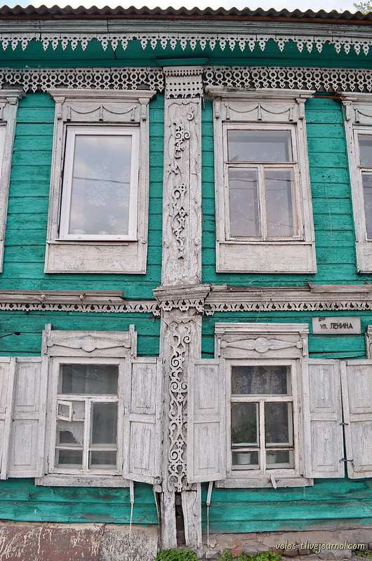 Бывший дом Юдалевичей выглядит очень нарядно за счет богатого резного ажурного декора карниза кровли и межэтажного пояса, а также досок вертикальной и угловой обшивки. Более скромно выглядят наличники, украшенные резными накладками только по верхнему щитку. Впечатление усиливает контраст окрашенных в белый цвет декорированных элементов и бирюзового фасада.