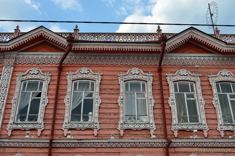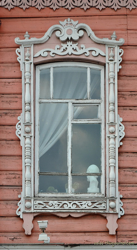 В оформлении фасада здания использована сквозная и накладная резьба. Ажурные узоры украшают карниз кровли с треугольными фронтончиками, завершение фасада и межэтажный пояс, доски вертикального членения и угловой обшивки здания, верхний и нижний щитки наличников (на боковинах сочетаясь с объемной резьбой в виде наборных колонок).