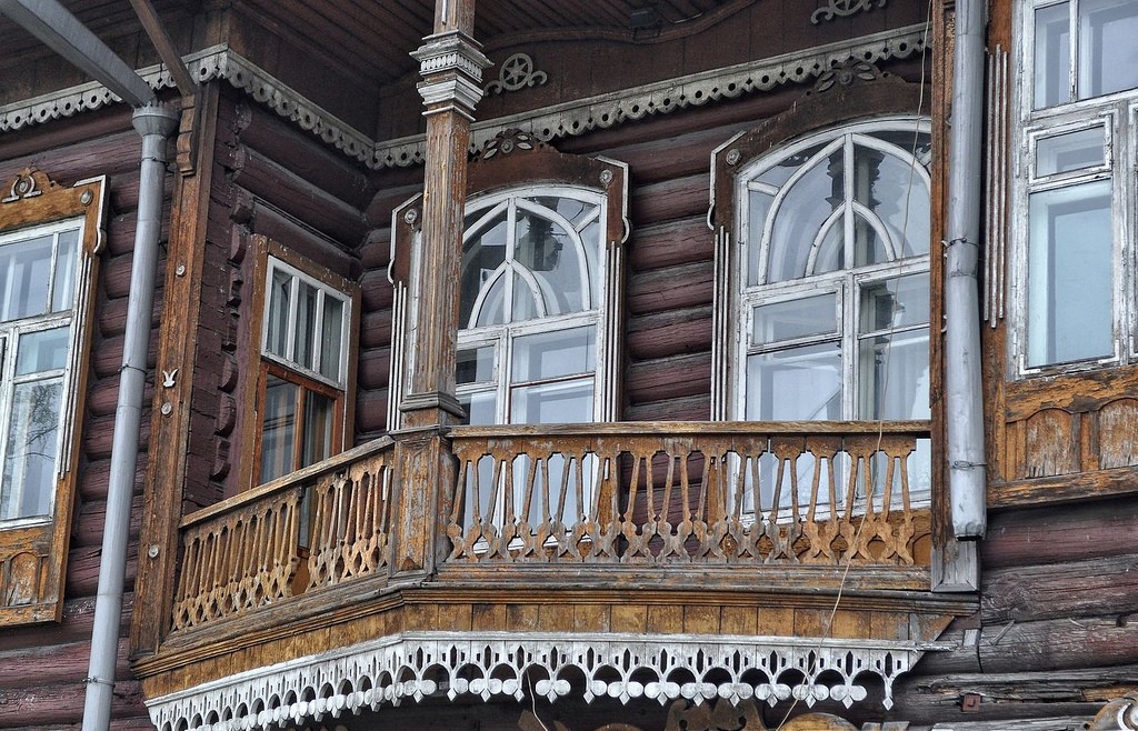 Основная часть окон – прямоугольные с фрамугами, имеют мелкую расстекловку, обрамлены наличниками с широкими фартуками, украшенными на первом этаже ажурной накладной резьбой, на втором этаже – тремя филенками. Ажурное ограждение лоджий выполнено из пропильной резьбы.
