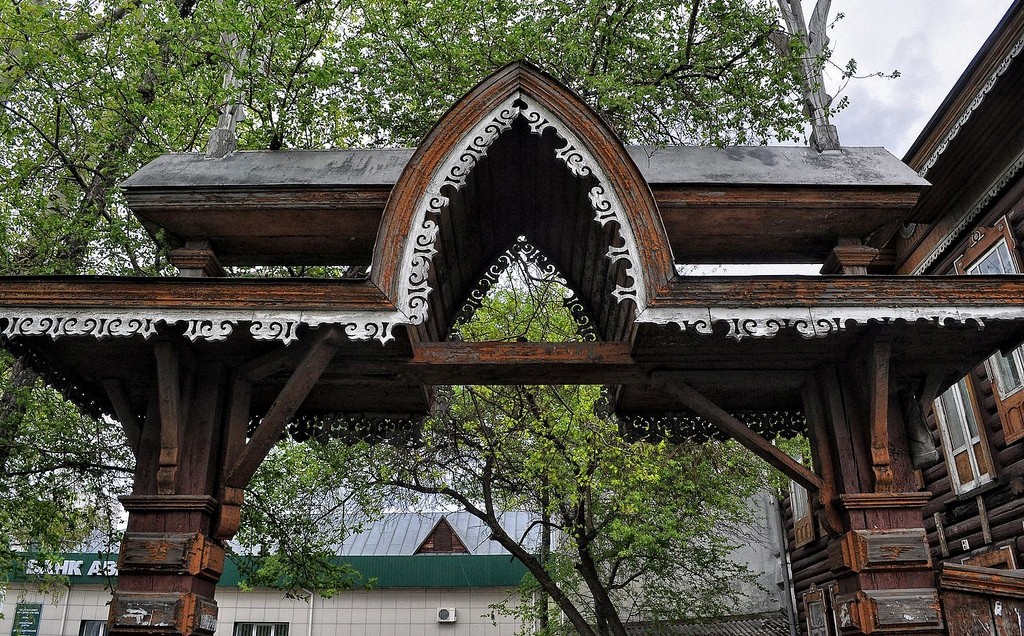 К северному фасаду, продолжая главный фасад, примыкает декоративная ограда с резными воротами, выполненными в одной стилистике с убранством фасадов.