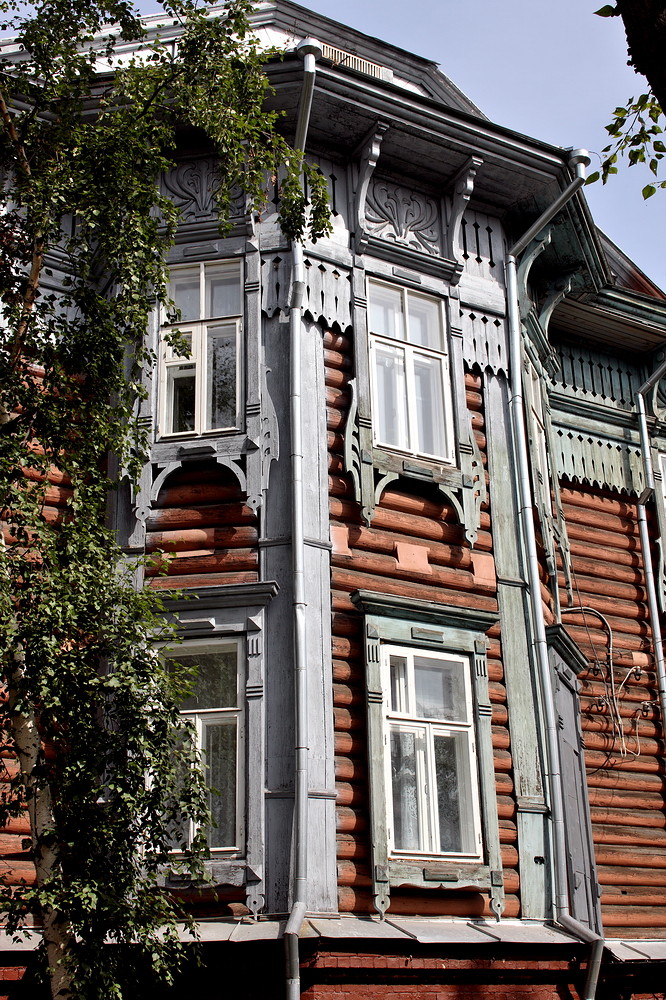 Близко поставленные прямоугольные оконные проемы второго и третьего этажей обрамлены простыми наличниками с небольшой порезкой и накладными элементами. Наличники второго этажа завершены прямыми профилированными полочками, в то время как наличники третьего составляют единый декоративный комплекс с фризом и членящими его кронштейнами.
