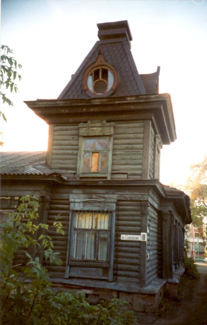 Постройка представляла собой деревянный одноэтажный дом с мансардным этажом в виде четырехгранной башни. Она была расположено в восточной части исторического центра города и занимала угловое положение на пересечении двух улиц: Слободской и Звездова. Стены одноэтажного на высоком цоколе строения под высокой вальмовой кровлей были сложены из бревен без остатка, стыки бревен обшиты тесом. Южную часть здания венчает четырехгранная башенка. Г-образный в плане объем строения усложнен со стороны южного и западного фасадов незначительно выступающими, но протяженными ризалитами и двумя прямоугольными сенями в северной части. Со стороны дворового (северного) фасада был пристроен кирпичный тамбур с более поздними прямоугольными сенями. По всему периметру строения проходил профилированный карниз большого выноса и широкий тесовый пояс.